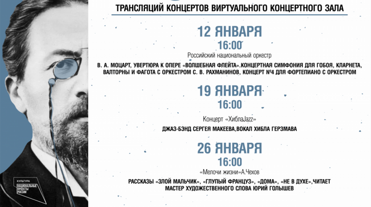 Так, 12 января состоится трансляция концерта Российского национального оркестра, а 19 января оперная дива, обладательница уникального голоса Хибла Герзмава в сопровождении джаз-бэнда под управлением Сергея Макеева исполнит известные джазовые стандарты, популярные песни и старинные романсы в неповторимых аранжировках.