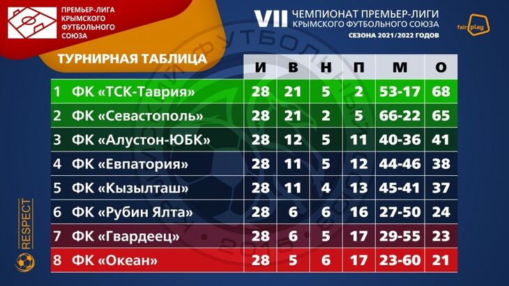 Симферопольская «ТСК-Таврия» на своем поле со счетом 3:0 обыграла гостей из ФК «Рубин Ялта» и стала чемпионом Премьер-лиги КФС-2021/22, опередив ближайшего преследователя в лице ФК «Севастополь» на три очка.