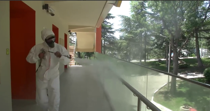 Подразделения РХБ защиты Черноморского флота проводят дезинфекцию в международном детском центре «Артек» в Крыму. Фото: Минобороны РФ Обрабо...