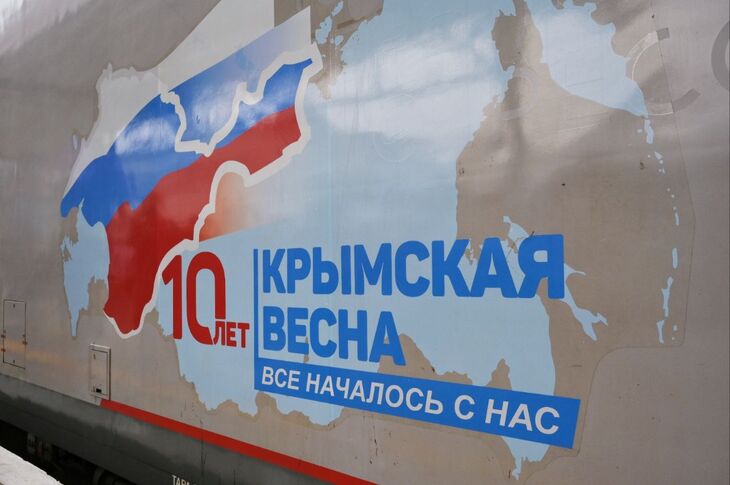 Часть вагонов двухэтажного поезда №28/27 «Таврия» украшена картой Крымского полуострова в цветах российского триколора, а также дельфинами и...