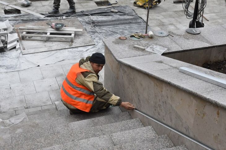 На площади Советской в Алуште ведутся работы по укладке гранита и подготовительные работы по обустройству центральной входной лестницы и пан...