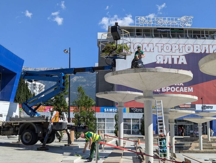 В Ялте продолжается благоустройство города к летнему сезону. На площади Советской восстанавливают вертикальное озеленение оригинальных конст...