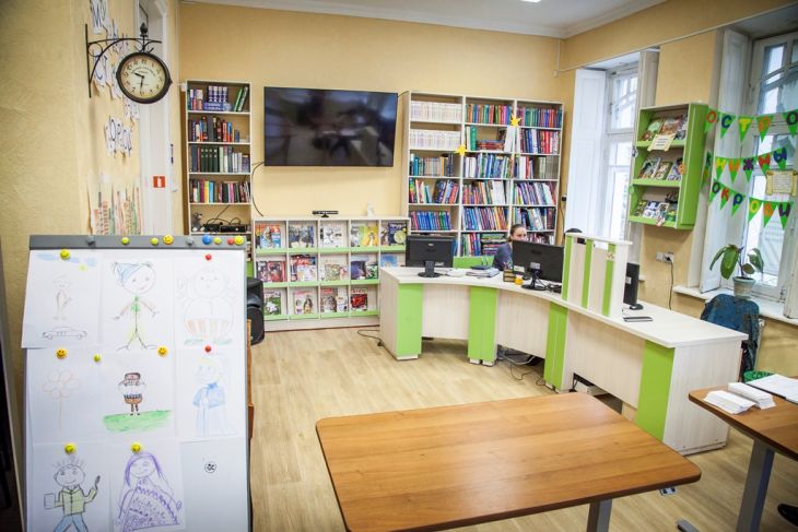 Помещения детской библиотеки теперь тоже оформлены в едином дизайнерском стиле и проведена замена старой мебели на современную и функциональную (библиотечные шкафы и стеллажи, детские столики и стульчики, диваны и пуфы), а также эргономичные и практичные мебельные конструкции дополняют мультимедийные экраны, активно использующиеся при проведении культурно-зрелищных мероприятий.