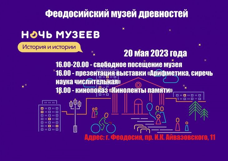 20 мая Феодосийский музей древностей присоединится к ежегодной акции «Ночь музеев — 2023». В этом году мероприятия пройдут с 16.00 до 20.00. «Ночь музеев — 2023» посвящена Году педагога и наставника и пройдёт под единым девизом «История и истории».
