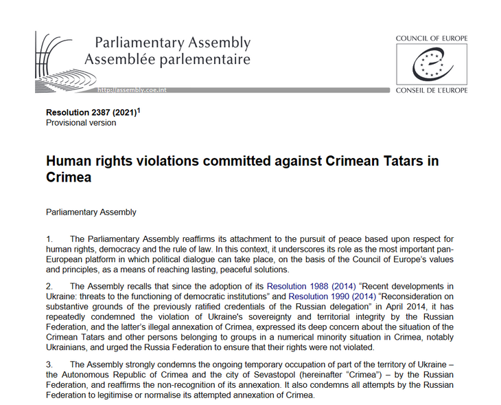 ПАСЕ приняла резолюцию, в которой призвала российские власти прекратить применение в Крыму законодательства РФ, в частности, по вопросам, связанным с терроризмом и экстремизмом, и «в соответствии с международным правом использовать законы, действующие на Украине».