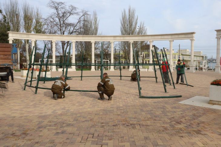 Пока в Крыму фиксируют аномальную жару, в Керчи на центральной площади им. Ленина уже приступили к установке главной городской ёлки.