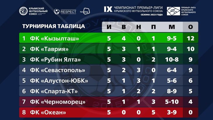 После пятого тура чемпионскую гонку по-прежнему возглавлят «Кызылташ». Но всего на расстоянии одной победы от бахчисарайцев располагаются «Таврия», «Рубин Ялта» и «Севастополь».