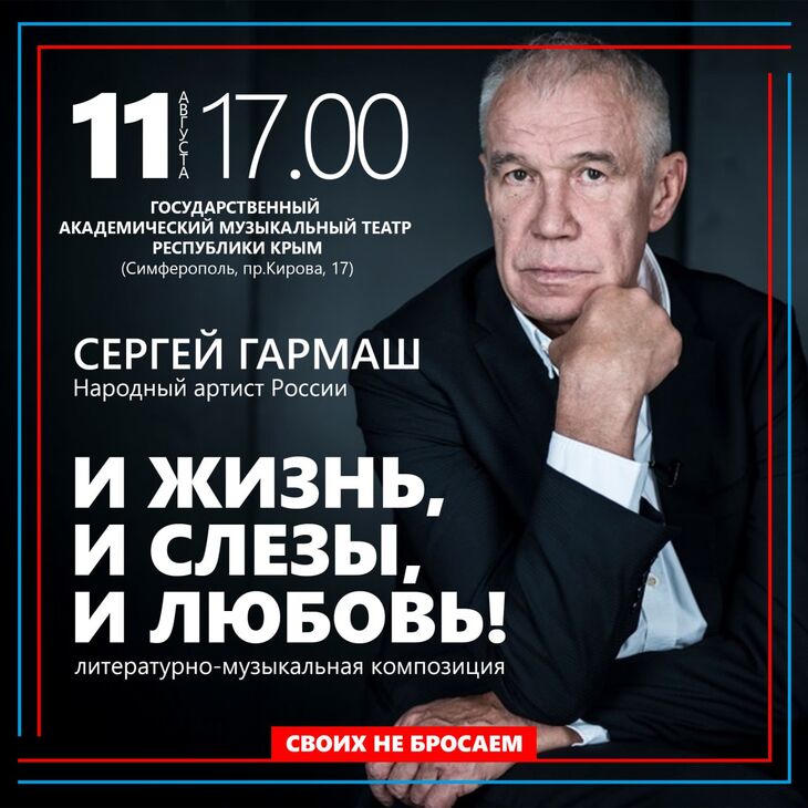 Начало концерта состоится в 17:00, 11 августа в ГАУ РК «Государственный академический музыкальный театр Республики Крым» по адресу: Симферополь, проспект Кирова, 17. В программе Литературно-музыкальная композиция в исполнении Народного артиста России Сергея Гармаша «И жизнь, и слезы, и любовь!» по произведениям К.Паустовского и А.Куприна.