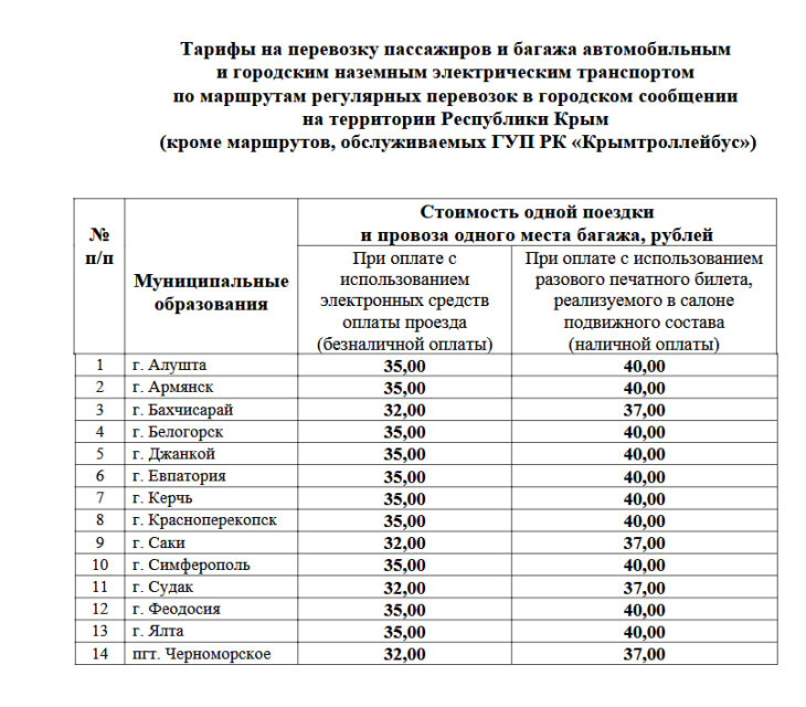 Минимальная стоимость проезда в городах Крыма составляет 32 рубля при безналичной оплате и 37 рублей при оплате наличными, а в большинстве муниципалитетов — 35 и 40 рублей соответственно.