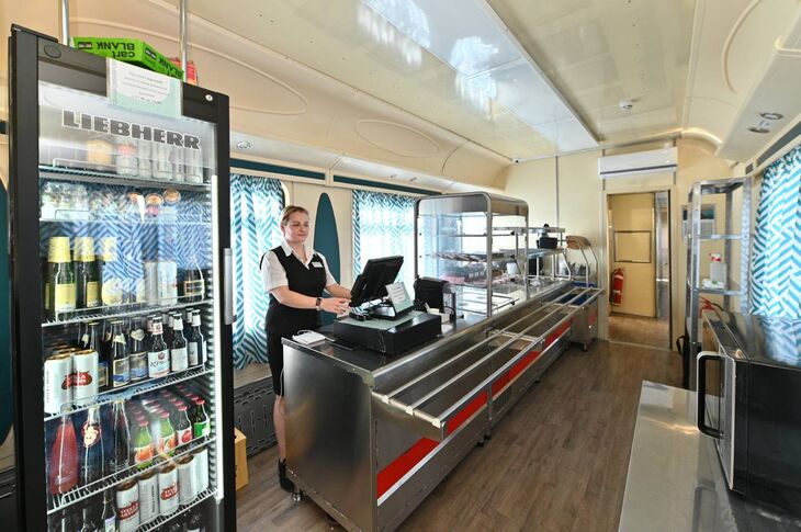 В зале вагона-столовой расположены восемь столиков на четырех человек. По сравнению с вагоном-рестораном появились зона мини-раздачи с подогревом, бойлер и микроволновка, а также стеллаж для подносов с грязной посудой.