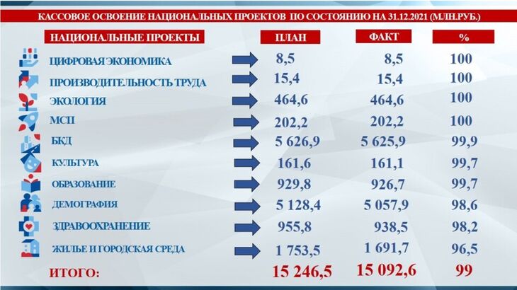 «На реализацию 11 национальных проектов в бюджете Республики Крым на 2021 год было предусмотрено 15,246 млрд рублей. По состоянию на 31 декабря 2021 года кассовое исполнение составило 15,092 млрд рублей, или 99%», – отметили в пресс-службе.