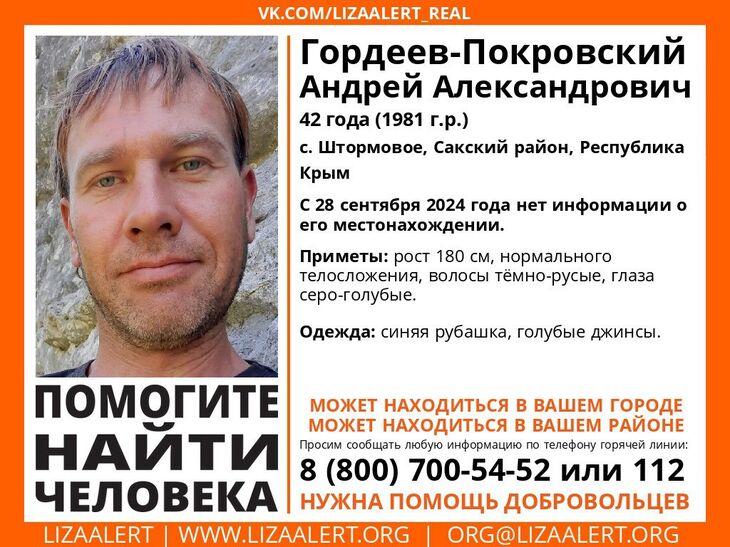 В селе Штормовое (Сакский район) пропал Андрей Гордеев-Покровский. Поиски мужчины ведутся с прошлой недели, сообщает поисково-спасательный отряд «Лиза Алерт» Крым.