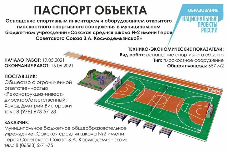 Специалисты подрядной организации в Сакской школе № 2 им. Героя Советского Союза Зои Анатольевны Космодемьянской завершили работы по подготовке основания и монтажу бортового камня на открытом плоскостном спортивном сооружении для занятия физической культурой и спортом.