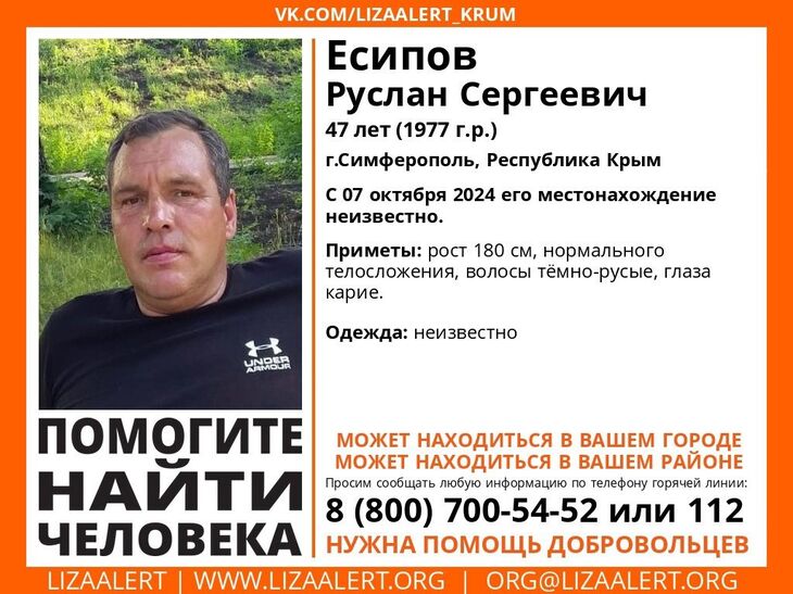 В Симферополе пропал 47-летний Руслан Есипов. Поиски мужчины ведутся с 7 октября, сообщает поисково-спасательный отряд «Лиза Алерт» Крым.