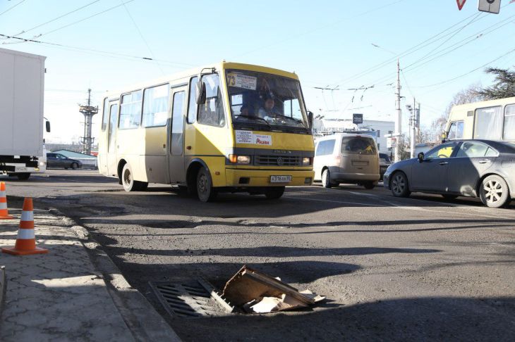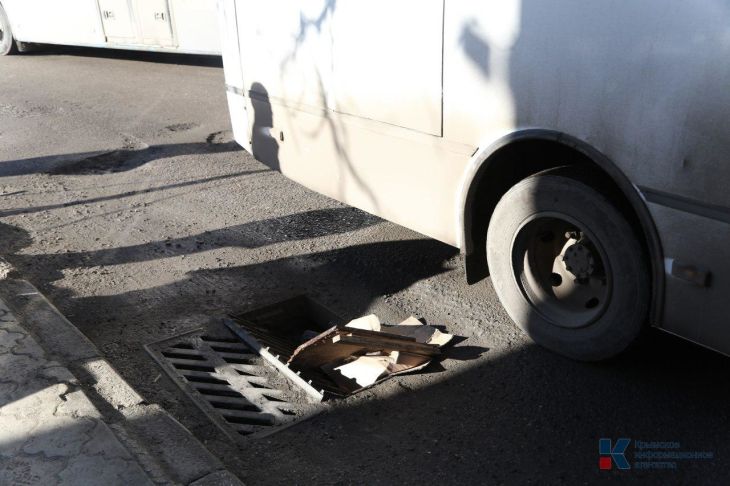 Как сообщает корреспондент КИА, «жертвами» открытой ямы с торчащим куском фанеры, образовавшейся в результате того, что ливневая канализация осталась без решеток, становятся в большинстве своём маршрутки и троллейбусы, которые при развороте не замечают автоловушку.
