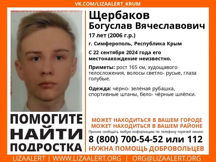 В Симферополе несколько дней ищут пропавшего Богуслава Щербакова. Парень пропал 22 сентября с этого дня о его местонахождении ничего не известно, сообщает поисково-спасательный отряд «Лиза Алерт» Крым.