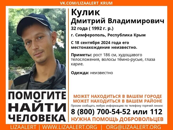 С 18 сентября о местонахождении Дмитрия Кулика неизвестно. Об этом сообщили в поисково-спасательном отряде «ЛизаАлерт».