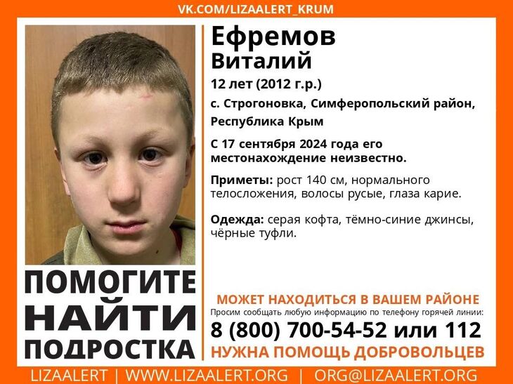 Виталий 2012 года рождения, ростом 140 сантиметров, нормального телосложения, с русыми волосами и карими глазами. Был одет в серую кофту, темно-синие джинсы и черные туфли.