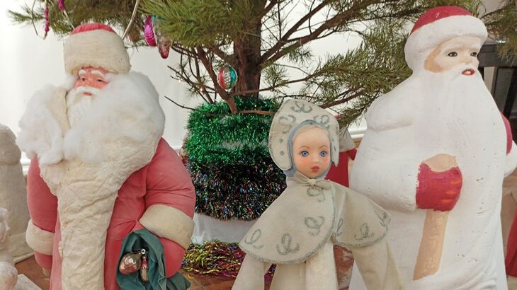 Кроме того, гостей ждёт огромная новогодняя ель, украшенная старинными ёлочными игрушками в виде стеклянных бус, шаров и сосулек, фигурок в виде героев сказок, животных, овощей и фруктов. Под ёлкой представлена коллекция Дедов Морозов и Снегурочек, изготовленных в 1940–1960-х гг.